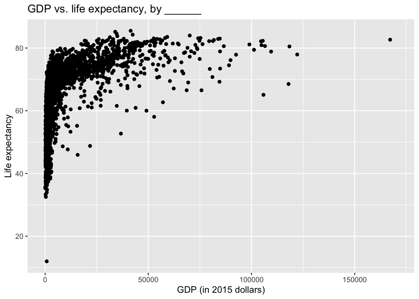 ggplot( data =wdi, mapping =aes(x =gdp, y =life_exp))+geom_point()+labs( x ="GDP (in 2015 dollars)", y ="Life expectancy", title ="GDP vs. life expectancy, by ______")