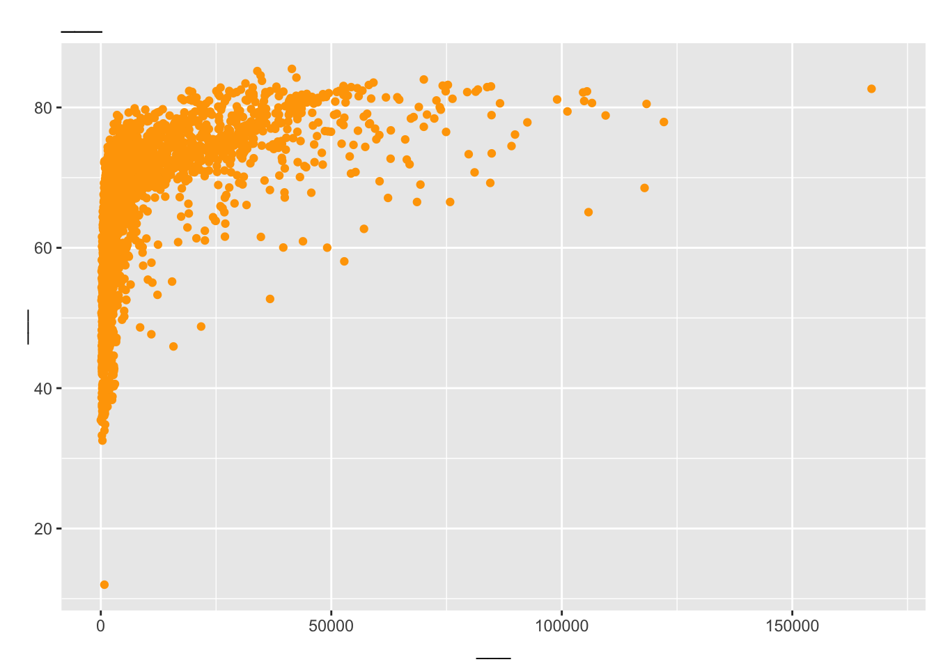 ggplot( data =wdi, mapping =aes(x =gdp, y =life_exp))+geom_point(color ="orange")+labs( x ="___", y ="___", title ="___")