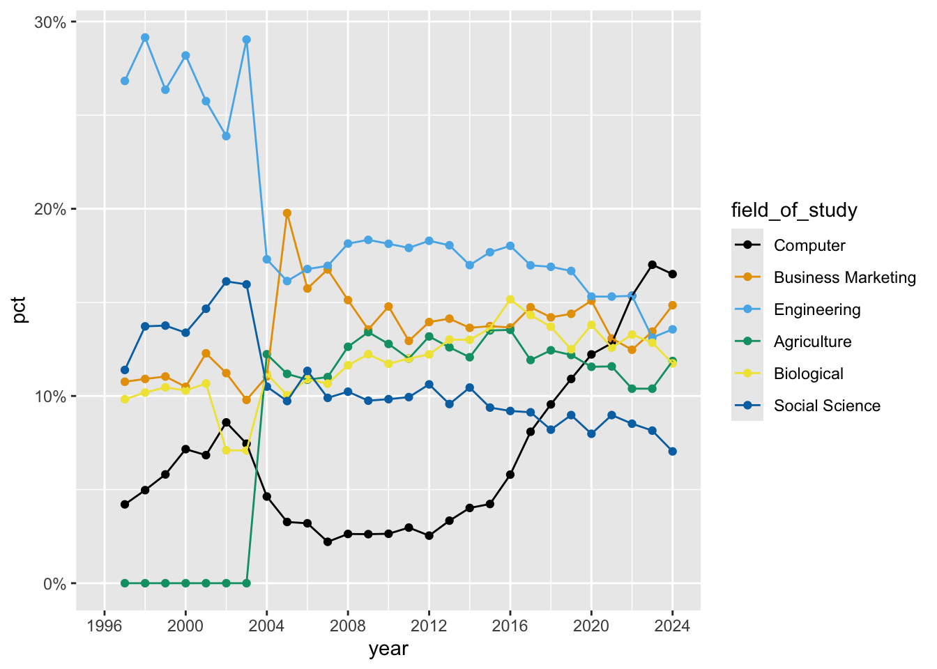ggplot(aes(x = year, y = pct, color = field_of_study)) +