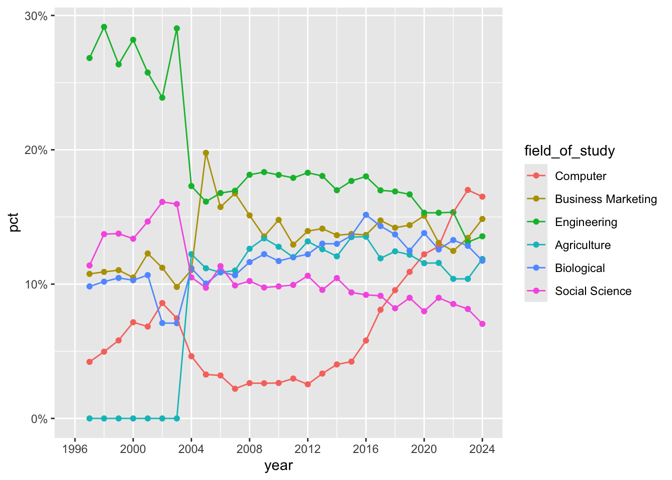 ggplot(mapping = aes(x = year, y = pct, color = field_of_study)) +