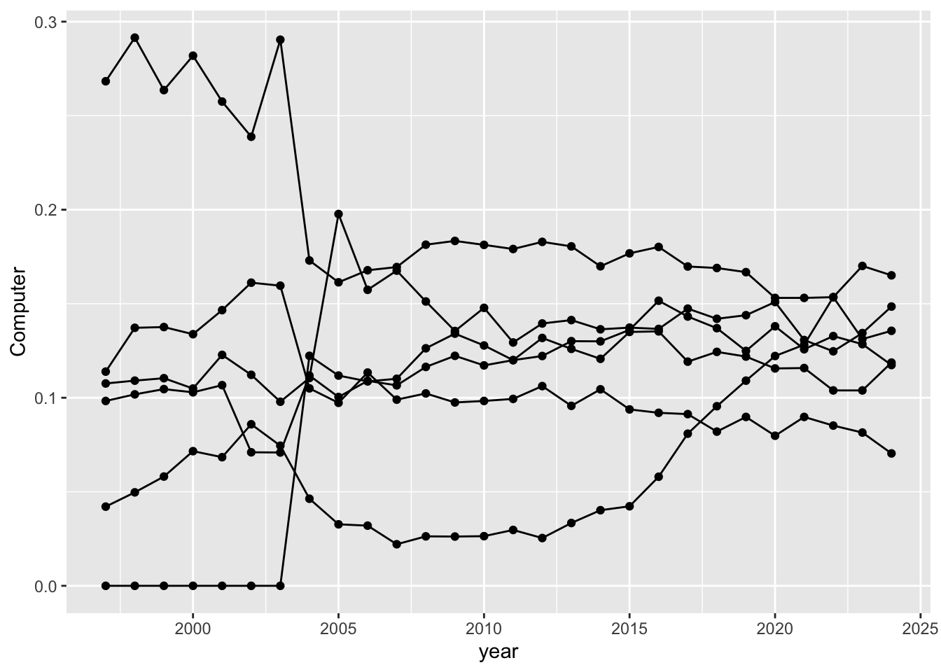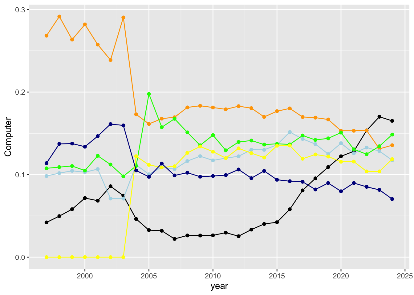 geom_line(mapping = aes(y = Computer, color = "Computer")) +