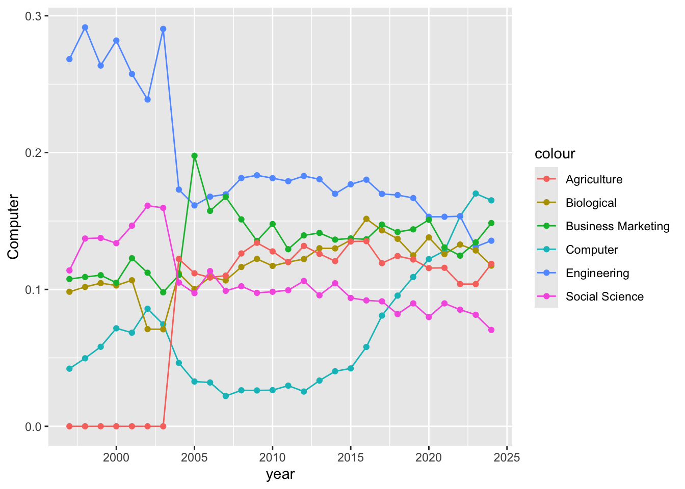 geom_line(mapping = aes(y = `Social Science`, color = "Social Science"))Polished up we get the same plot.