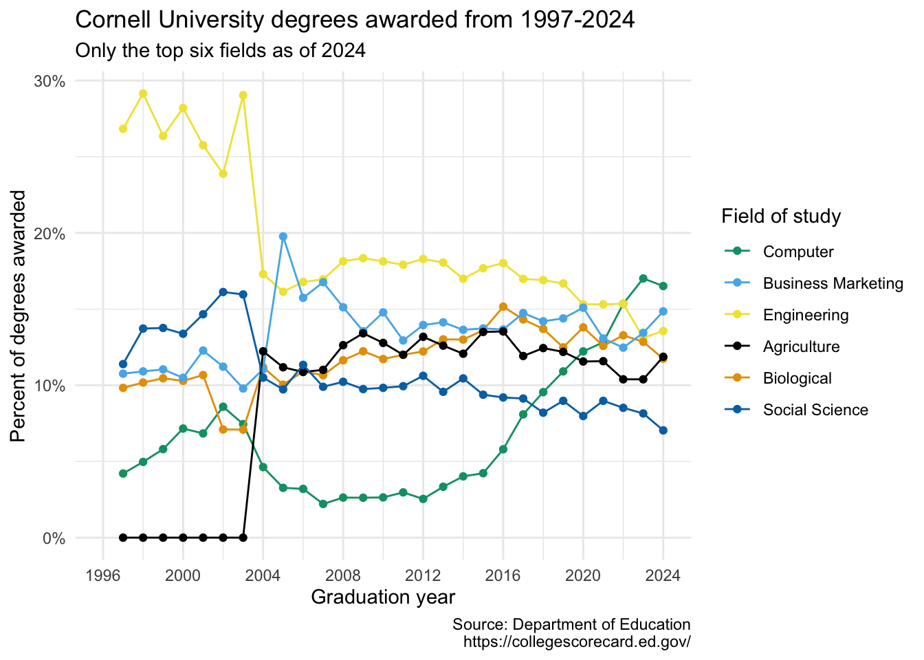 The dataset has 6 rows and 29 columns. The first column (variable) is the field_of_study, which are the 6 most frequent fields of study for students graduating in 2024.1 The remaining columns show the proportion of degrees awarded in each year from 1997-2024.