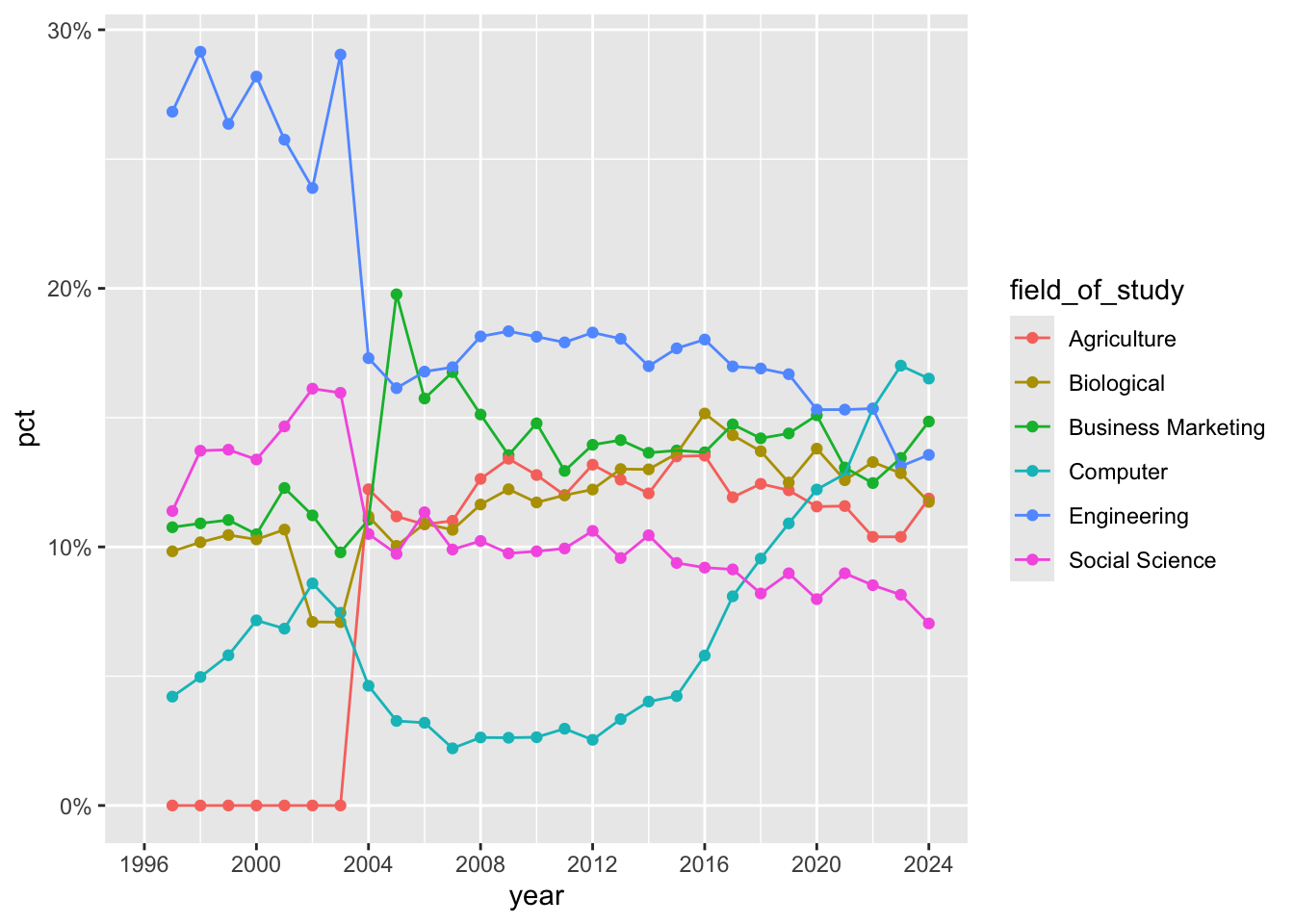 year,pct,field_of_studyRows: Combination of year and field of study