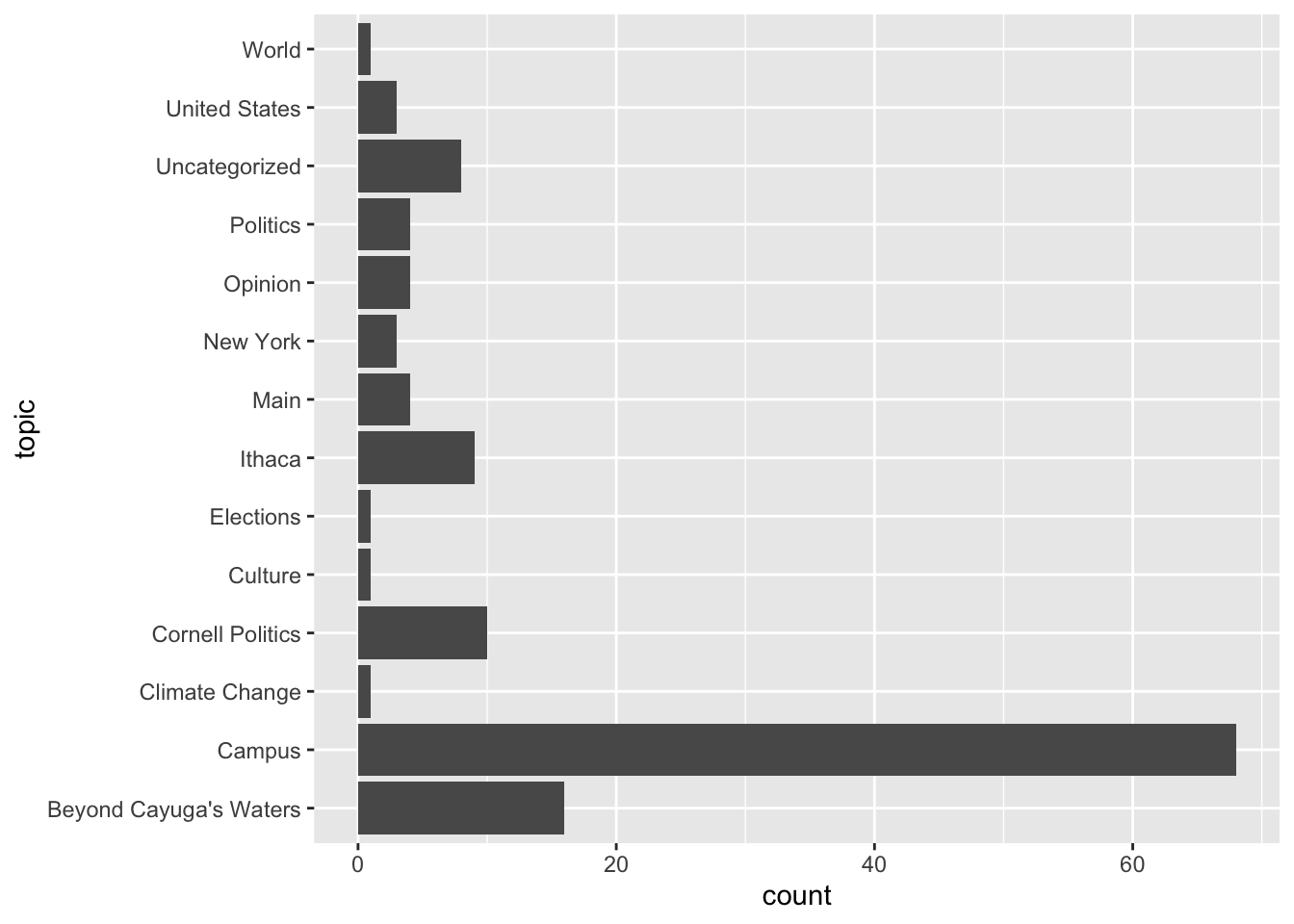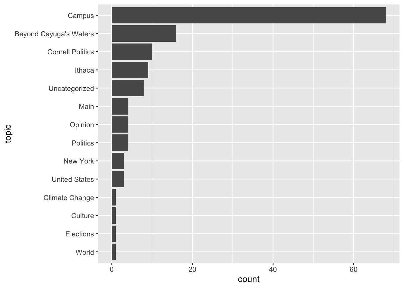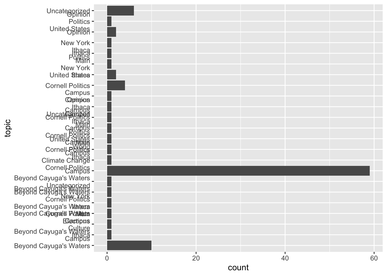 Notice the data frame now has additional rows. The unit of analysis is now an article-topic combination, rather than one-row-per-article. Not entirely a tidy structure, but necessary to construct a chart to visualize topic frequency.