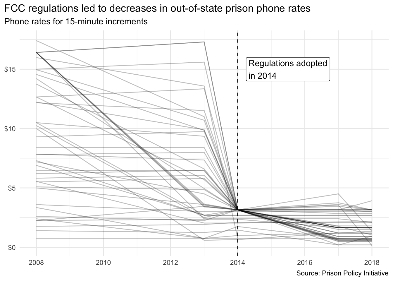 What impact did the FCC regulations have on out-of-state phone rates? In 2014, the Federal Communications Commission adopted regulations to cap the cost of phone calls from prisons and jails, successfully imposing caps on out-of-state phone rates. Scrape Appendix table 1 and reproduce the visualization below to report on the impact of this regulation on state prison out-of-state phone rates. The visualization should show the average cost of a 15-minute phone call from state prisons to out-of-state numbers over time. The dashed line should indicate the year 2014, when the FCC regulations were adopted.