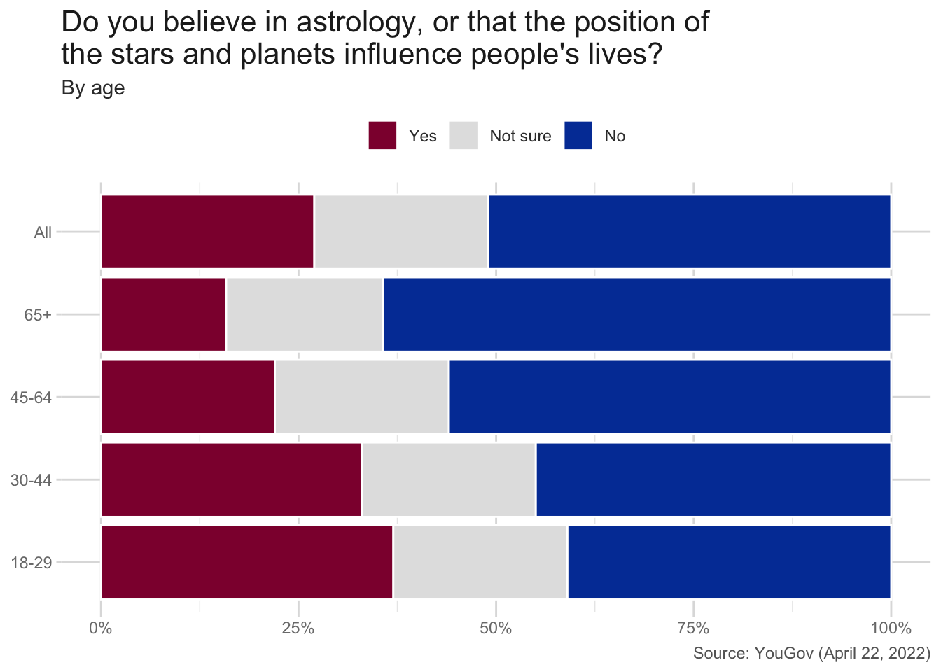 Astrology, or the belief that the position of the stars and planets can affect people’s lives, remains popular with many people in the United States. As of 2022, 27% of Americans believe that the position of the stars and planets influence people’s lives (see Figure 1).