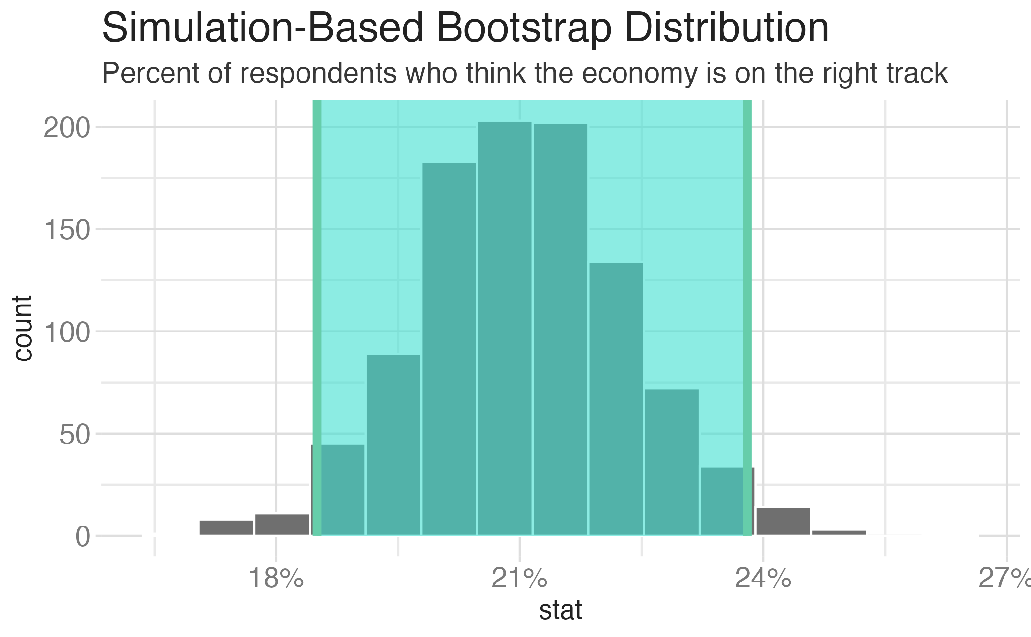 We are 95% confident that the true proportion of Americans who think the economy is on the right track is between 18% and 24%.